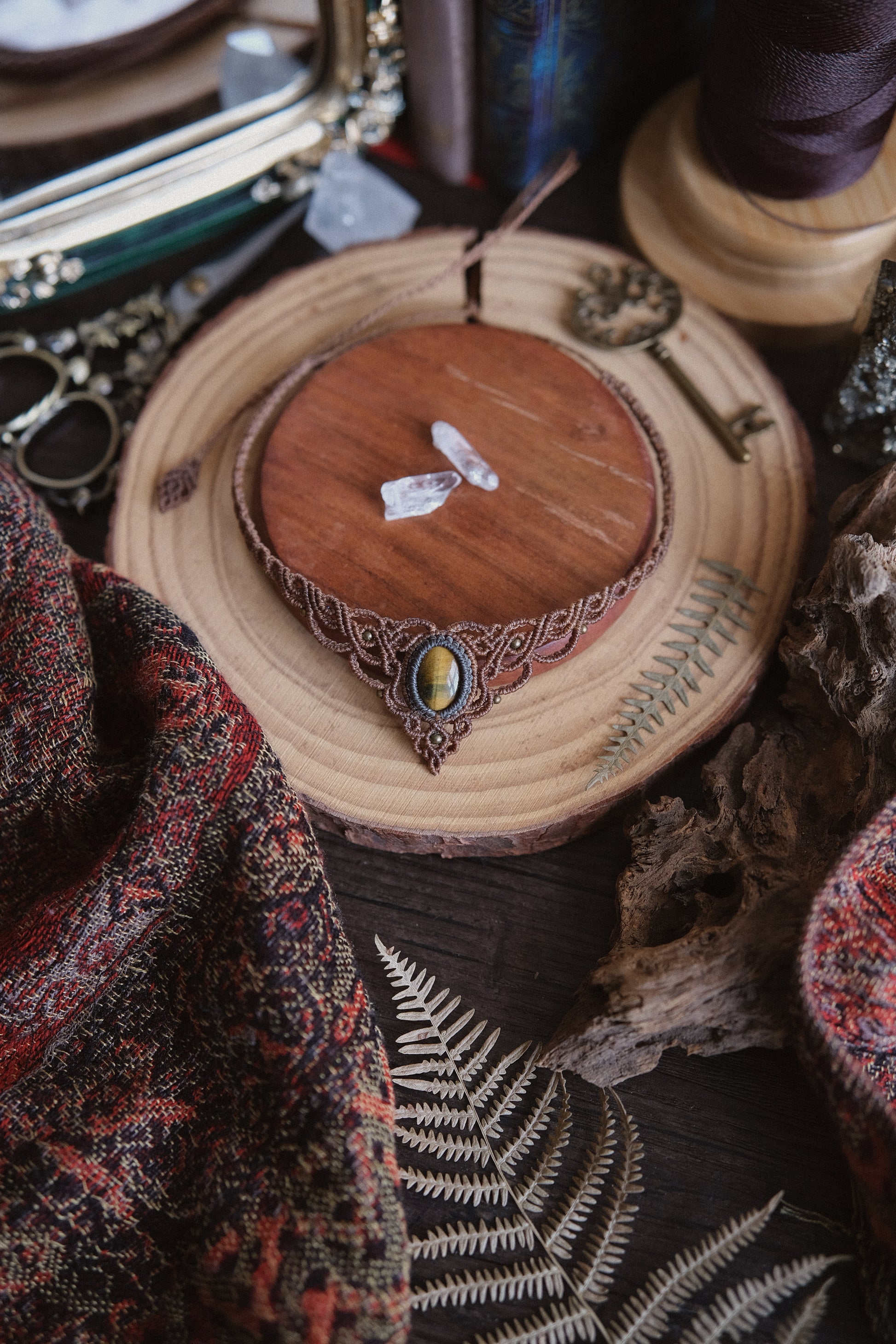 Die Halskette „Driade“ ist vollständig handgefertigt in Makramee-Technik und mit einem natürlichen Tigerauge verziert.