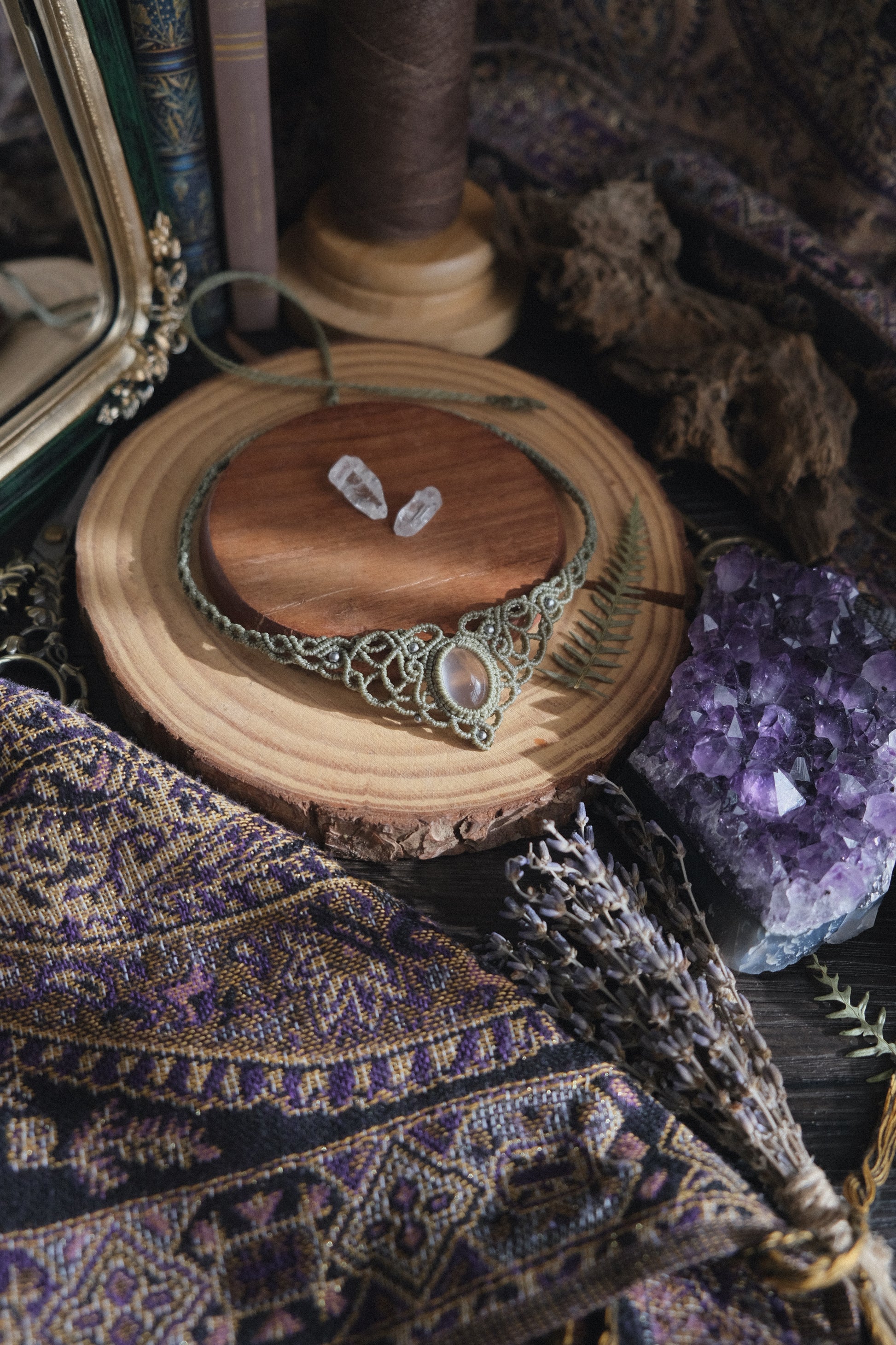 Die Halskette „Salice“ ist vollständig handgefertigt in Makramee-Technik und besteht aus natürlichem Rosenquarz.
