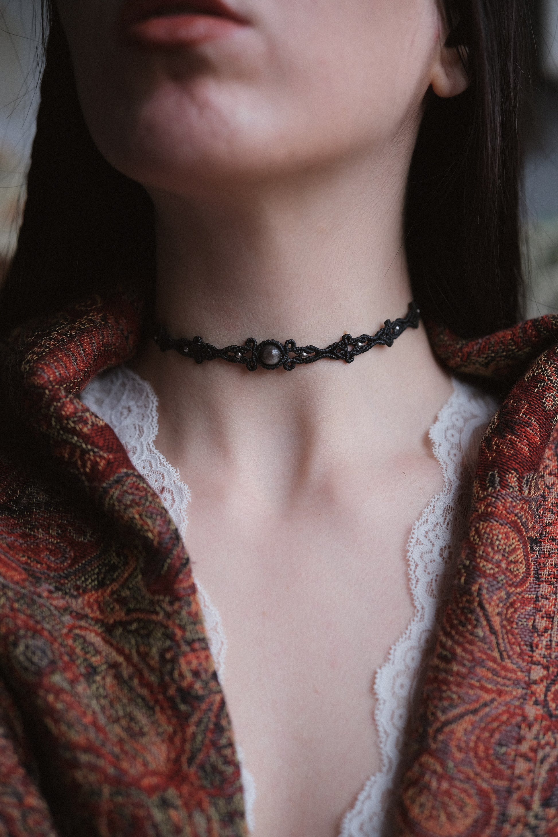 'Hesperis' choker made entirely by hand using the macramé technique, with natural Silver Obsidian stone.