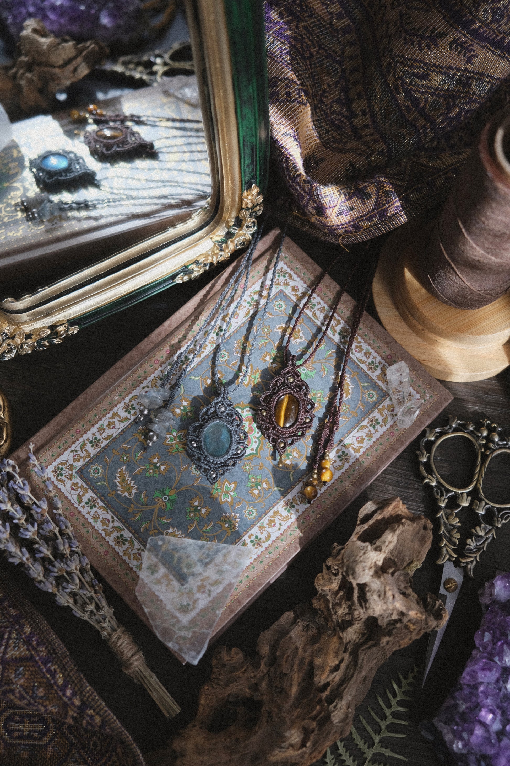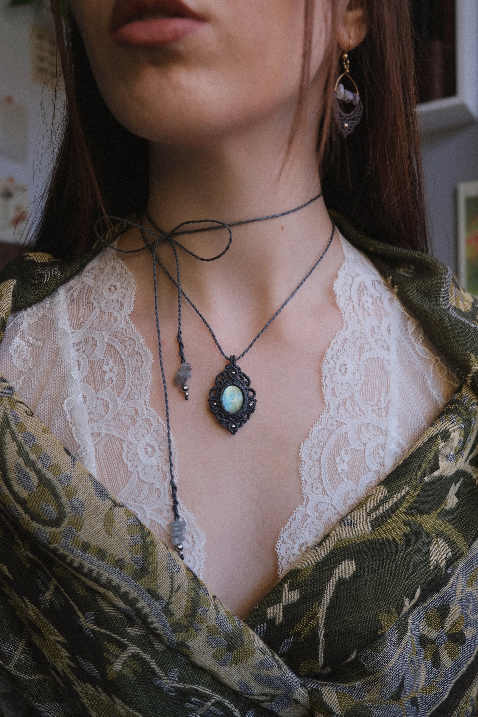 'Hydrangea' pendant made entirely by hand using the macramé technique, with natural Labradorite stone.