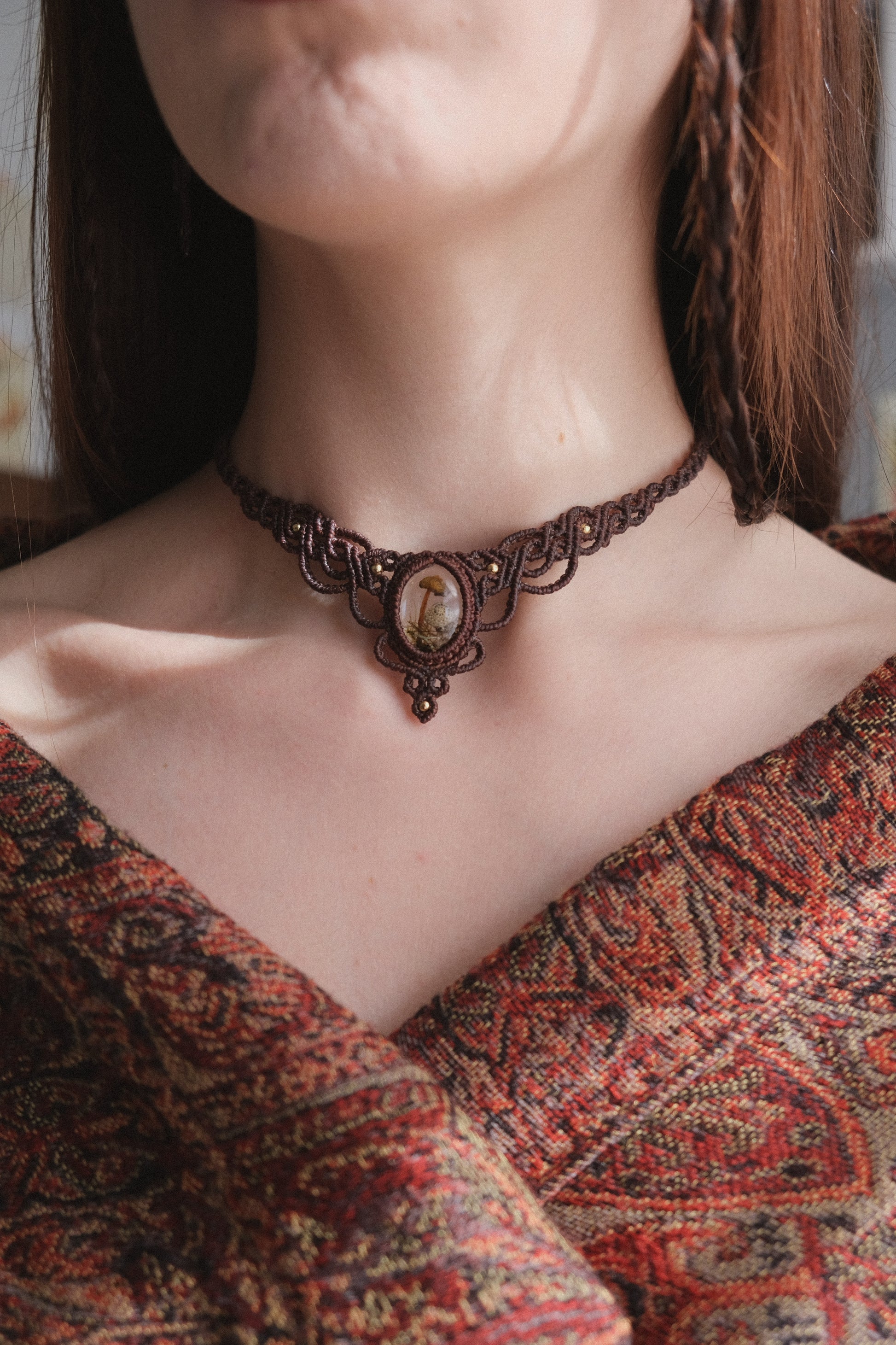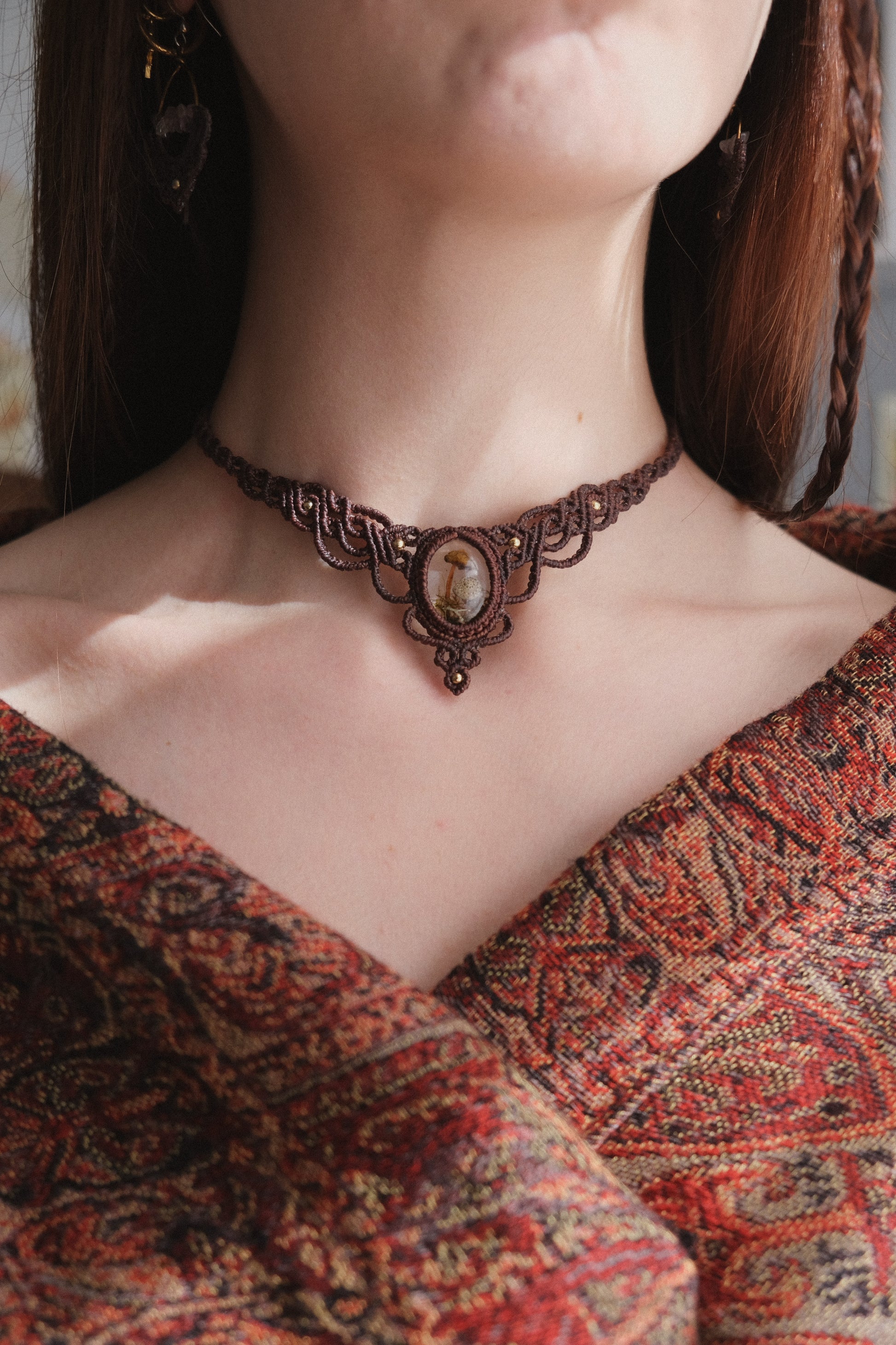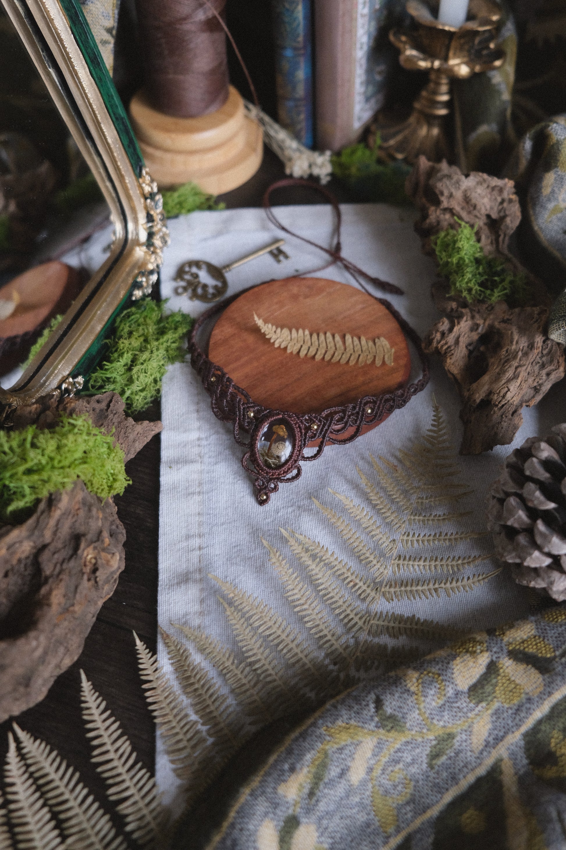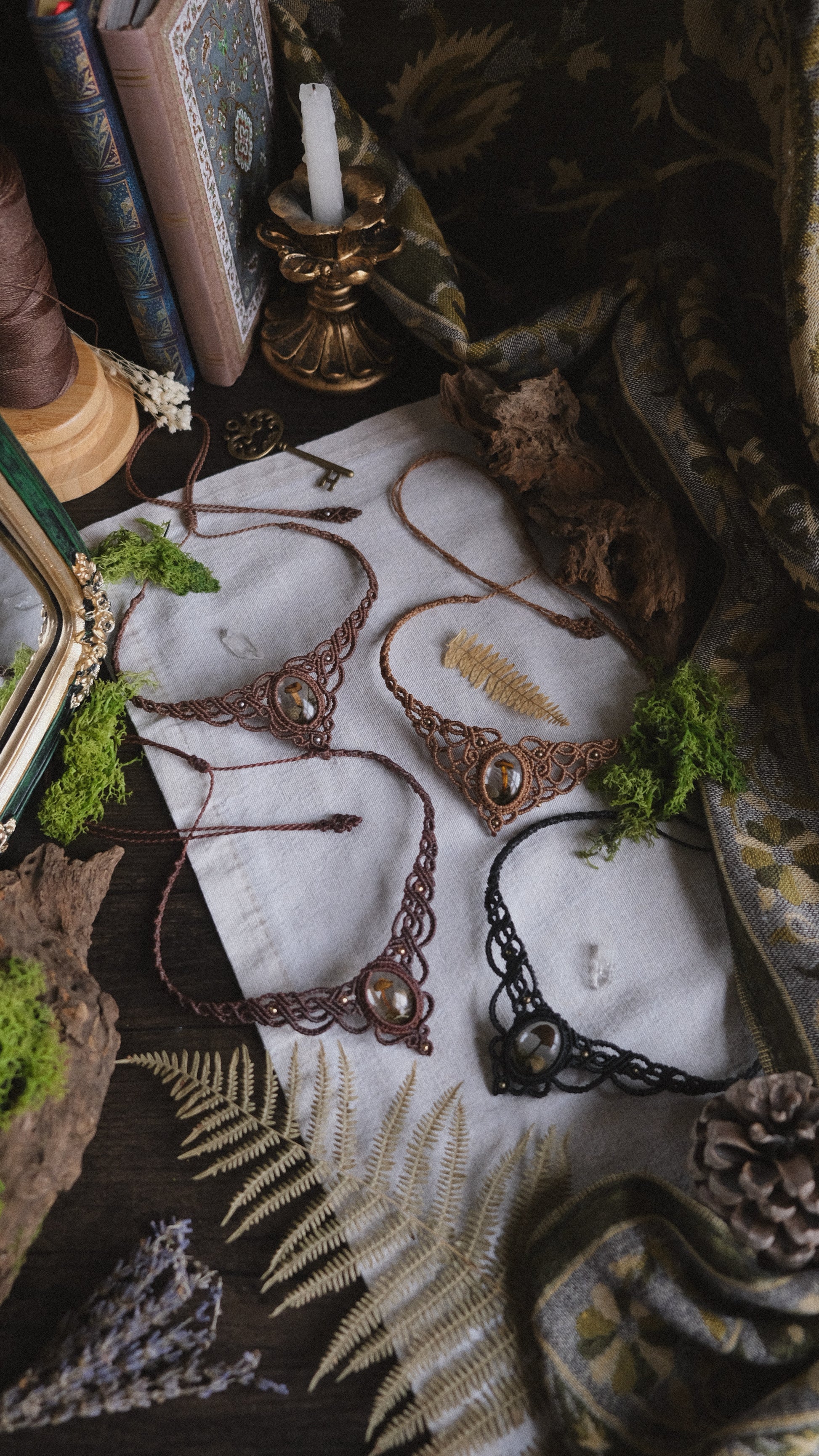 Hand-woven using the macramé technique and enriched with a resin cabochon that holds a small fragment of an enchanted forest.