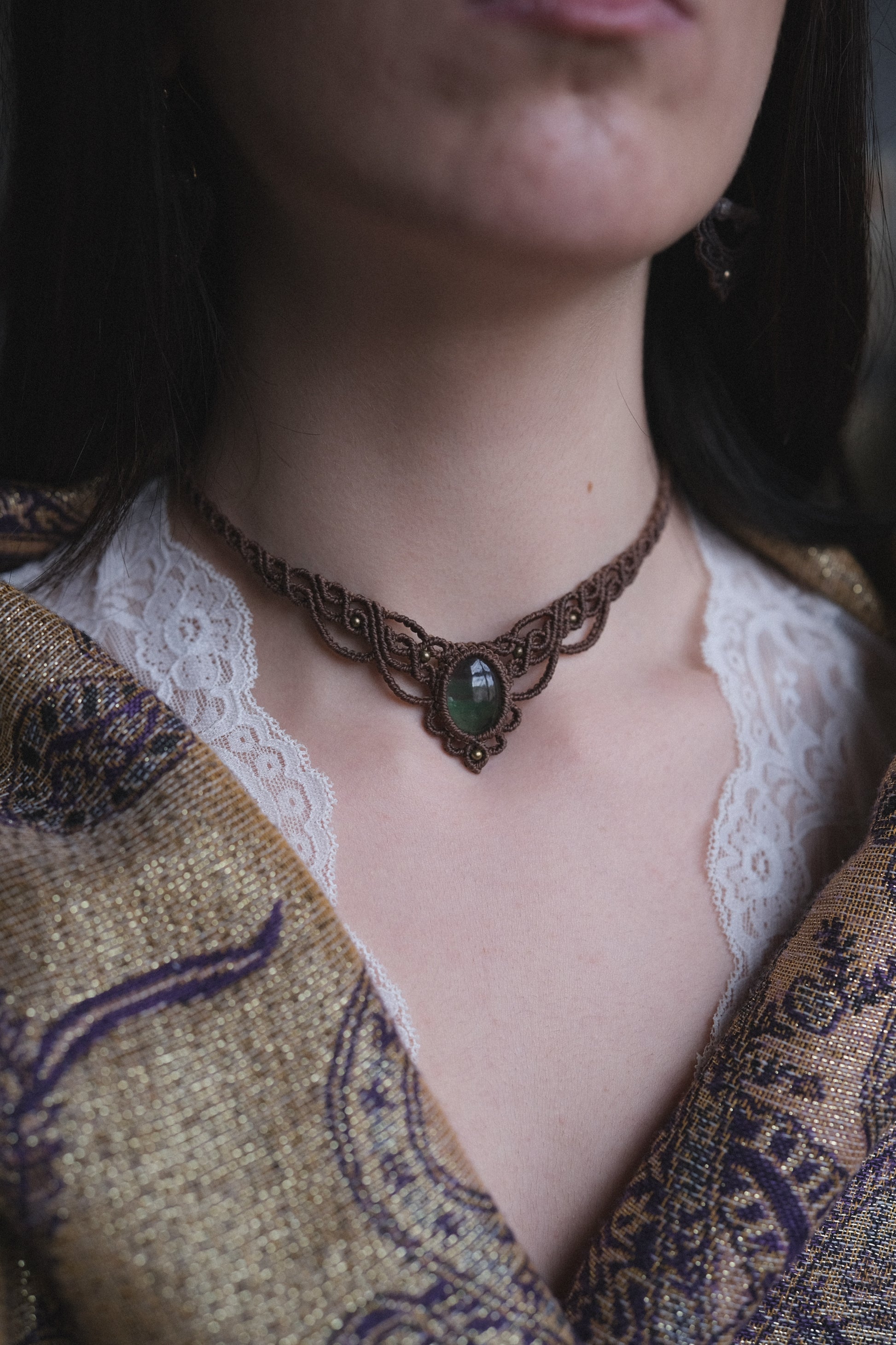 'Malva' necklace made entirely by hand using the macramé technique, with natural Fluorite stone