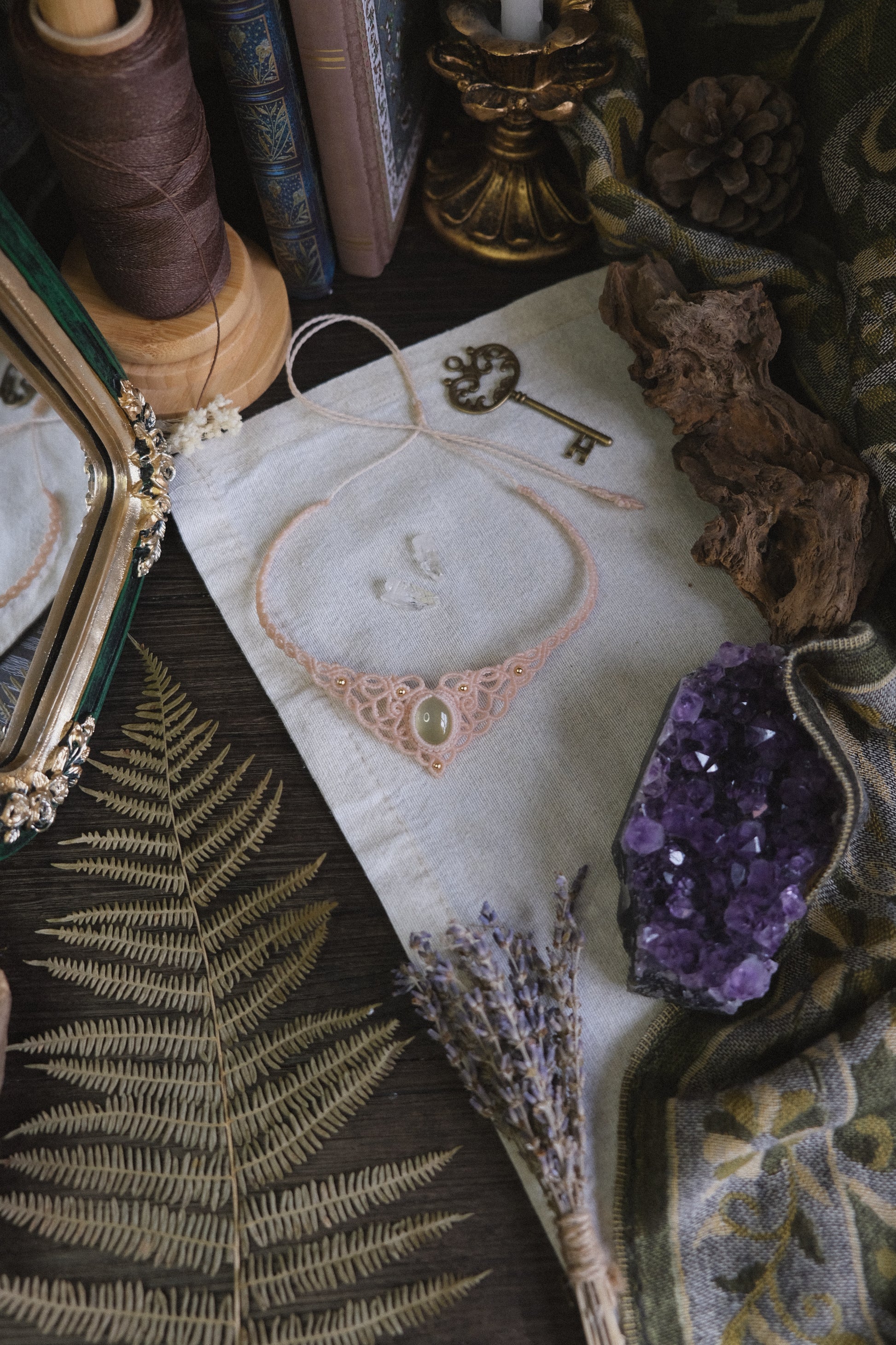 'Willow' necklace made entirely by hand using the macramé technique, with natural Prehnite stone
